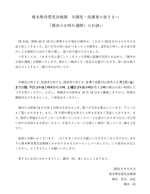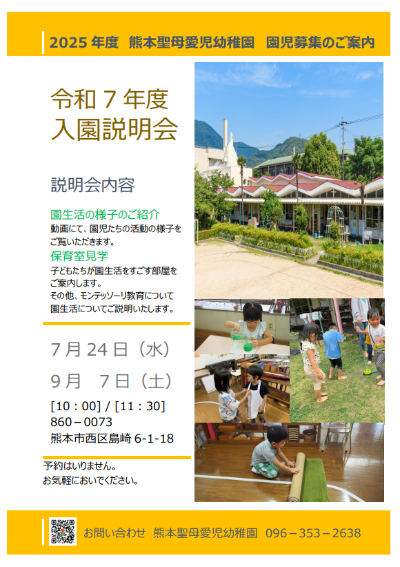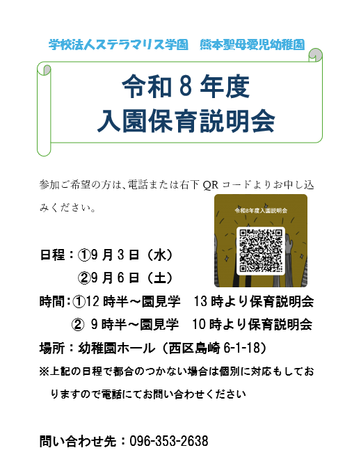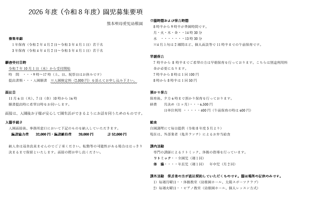 熊本聖母愛児幼稚園 2025年度(令和7年度) 園児募集要項